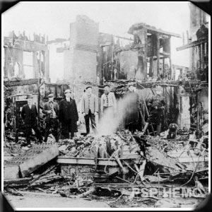 Men standing on the ruins of Wyoming